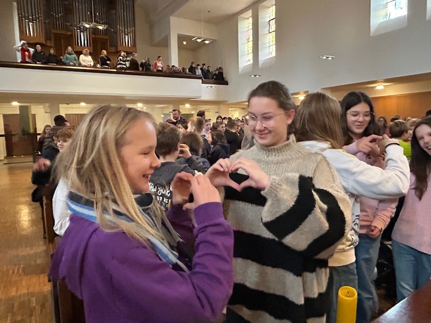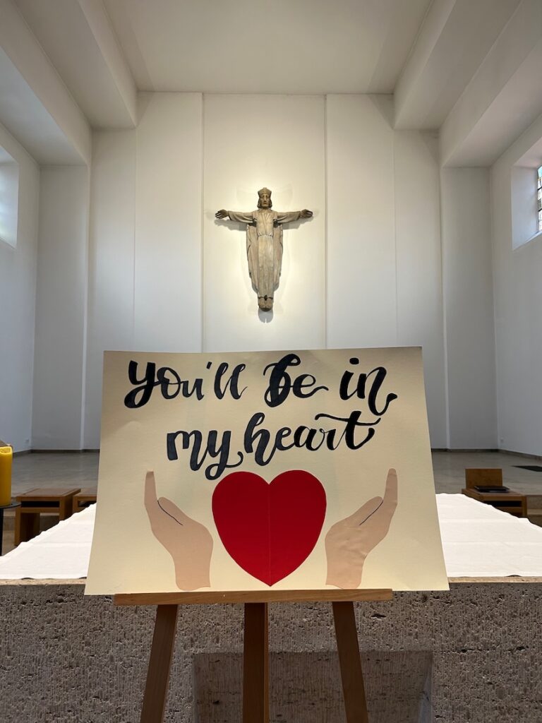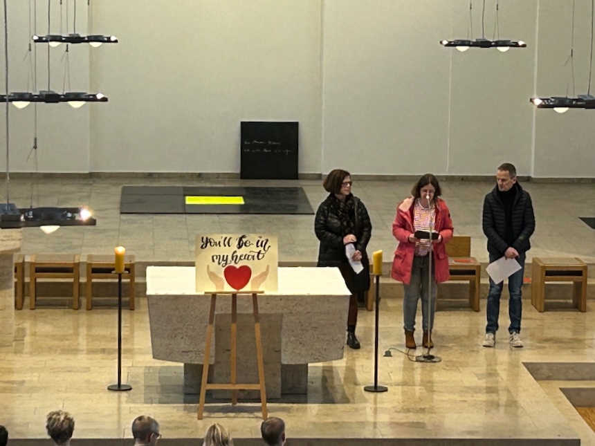 Die zentrale Thematik des Songs, nämlich die Kraft der Liebe und die Verbundenheit, die uns auch in schwierigen Zeiten trägt, fand sich in verschiedenen Elementen des Gottesdienstes wieder bis hin zum Friedensgruß, der mit Herzsymbol gestaltet wurde.