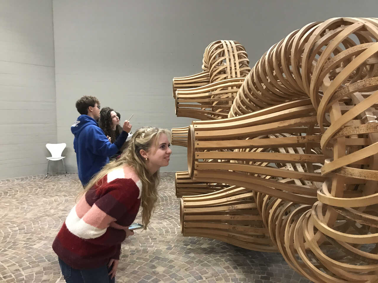 Im Dezember besuchten alle vier Kunstleistungskurse das Sprengel Museum Hannover. Dort galt es, in kreativen Workshops vor allem das Werk des britischen Künstlers Richard Deacon in Augenschein zu nehmen, welches unter anderem auch auf der aktuellen Liste des Kultusministeriums mit den abiturrelevanten Kunstwerken steht. Deacons raumfüllende Plastik What Could Make Me Feel This Way konnte im Museum aus allen Richtungen betrachtet und in selbst gewählten Ausschnitten abgezeichnet werden. Dabei wurde das zentrale Konzept des „Dazwischens“ – des Wechselspiels zwischen Innen und Außen – praktisch erfahrbar. Das Kunstwerk schwebt zwischen Organischem und Artifiziellem und löste vielfältige Assoziationen aus.