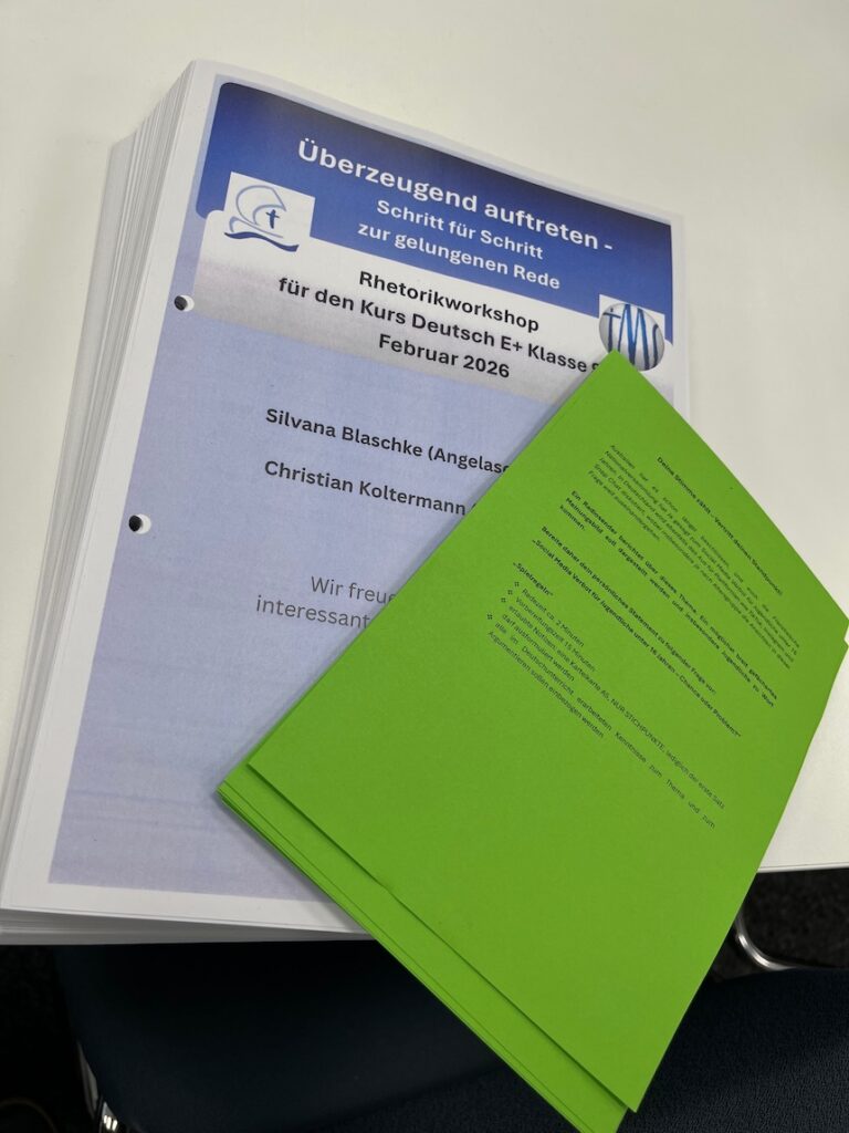 Am Freitag, den 27.02.26, trafen sich die Schüler:innen des E+-Kurses Deutsch (Jahrgang 9) der Thomas-Morus-Schule in den Räumlichkeiten der Angelaschule, um unter der Leitung von Frau Blaschke und Herrn Koltermann, unterstützt von Praktikantin Frieda Wenk ein umfassendes Rhetoriktraining zu absolvieren.