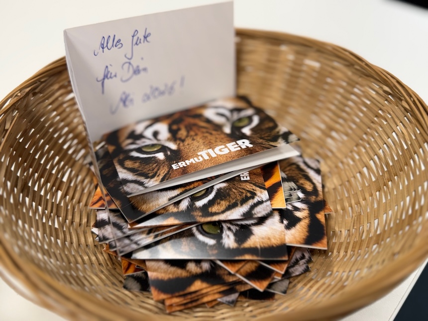 Musikalisch gab es ein vom Musik-LK ausgewähltes und mit Unterstützung eines kleinen Jahrgangschors gesungenes Potpourri von Schulgottesdienst-Lieblingsliedern der letzten neun Jahre. Und auf den Schreibtischen wird ein Ermu-Tiger (wahlweise eine Ermu-Tigerin) jede:n in den kommenden Wochen begleiten.