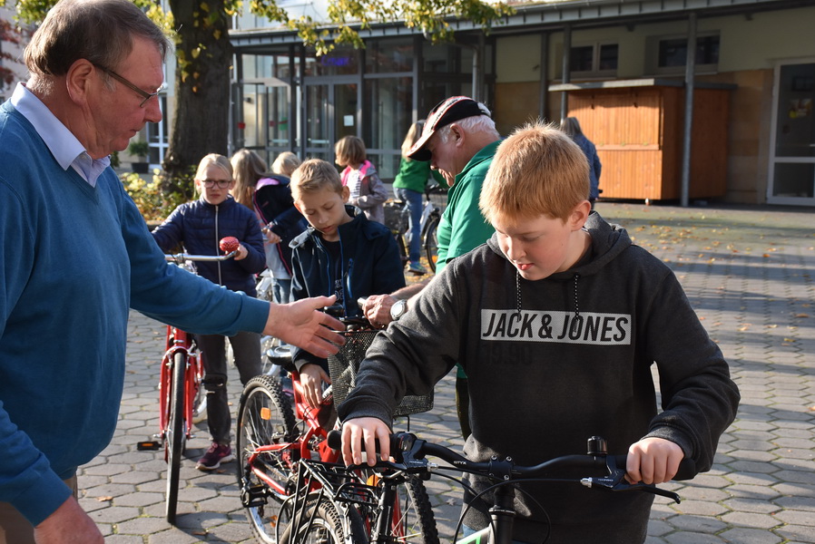 Am 19. Oktober, passend zu Beginn der dunklen Jahreszeit, wurden die Fahrräder der Schülerinnen und Schüler auf ihre Verkehrssicherheit überprüft. Die Lichtanlage, die Bremsen und die Reflektoren wurden von Herrn Lanver genau untersucht. An einigen Rädern sind Mängel festgestellt worden, die nun schnell behoben werden müssen.