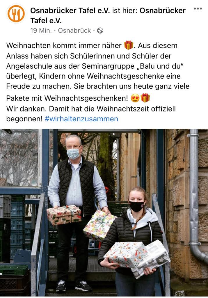 Das Corona Virus hat im Jahr 2020 für den Ausfall vieler Aktionen und Veranstaltungen in Osnabrück gesorgt. Die Maiwoche und der historische Weihnachtsmarkt fielen ins Wasser und auch das Weihnachtsfest in diesem Jahr war ganz anders; ohne die Gottesdienste in den Kirchen, die Besuche der ganzen Familie und der Zeit, die man sonst zusammen verbracht hat. Gerade in dieser Situation ist es uns, dem Seminarfach Balu und Du, wichtig, auch an die Menschen zu denken, die besonders darunter leiden.