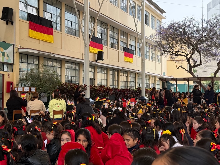 Doch zunächst erlebten wir an unserem ersten Tag und dem letzten Schultag vor den Ferien gleich ein befremdliches, jedoch für uns besonderes Highlight: Die Feier des Tags der Deutschen Einheit am Colegio Santa Ursula in Lima! Als Schule des Ursulinenordens mit deutschen Wurzeln (gegründet 1936 von deutschen Schwestern) wird hier nicht nur Deutsch als erste Fremdsprache unterrichtet – auch deutsche Kultur hat ihren festen Platz im Schulleben. Mit feierlichem Gesang der Nationalhymne, Schwarz-Rot-Gold in allen Variationen und viel Stolz wurde der 3. Oktober begangen. „Witzig“, meinte nicht nur eine Schülerin, „dass man erst nach Lima fliegen muss, um den Tag der Deutschen Einheit mal so richtig zu feiern.“