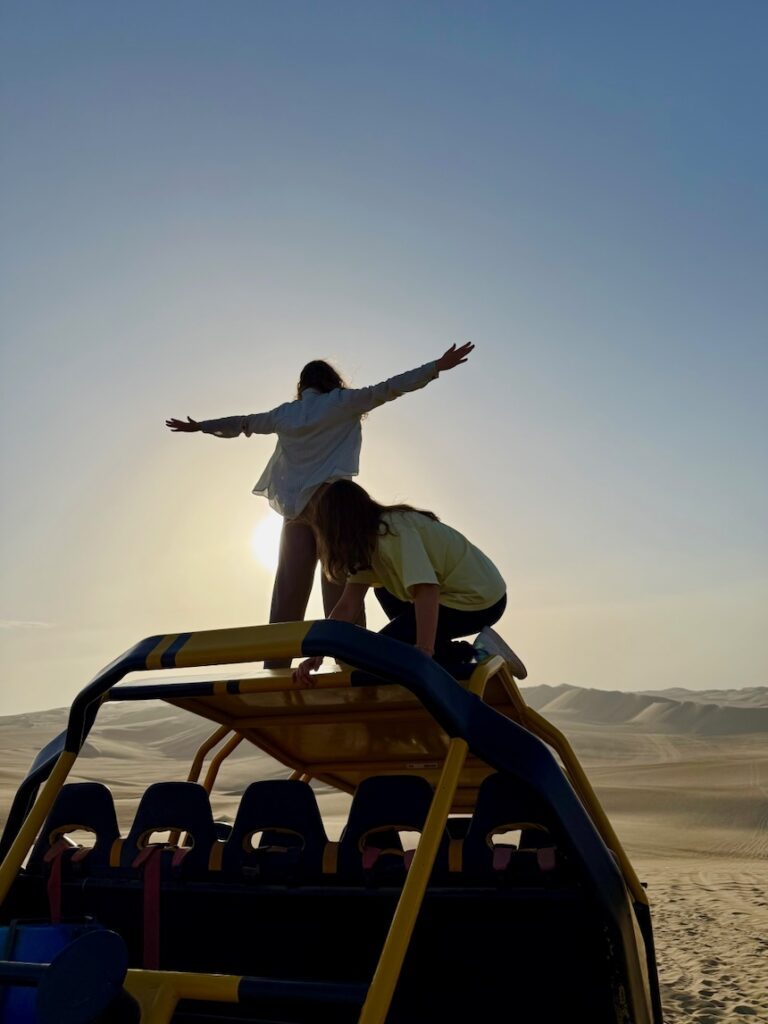 Am Montag folgte ein Tag, der uns allen lange in Erinnerung bleiben wird: Der Ausflug nach Paracas und später nach Ica war ein echtes Highlight. Mit dem Boot fuhren wir zu den Islas Ballestas, wo wir Humboldt-Pinguine und Seelöwen in freier Wildbahn erleben konnten. Der Staunen in den Gesichtern der Mädchen sprach Bände – für viele war es das erste Mal, so nahe an solche Tiere heranzukommen. Anschließend ging es weiter nach Huacachina, wo riesige Sanddünen auf uns warteten. Ob mit dem Buggy durch die Wüste rasen oder sich beim Sandboarden in den Abgrund stürzen – Adrenalin war garantiert. Ein Tag zum Zusammenwachsen, Lachen und Staunen – gemeinsam mit den peruanischen Austauschschülerinnen.