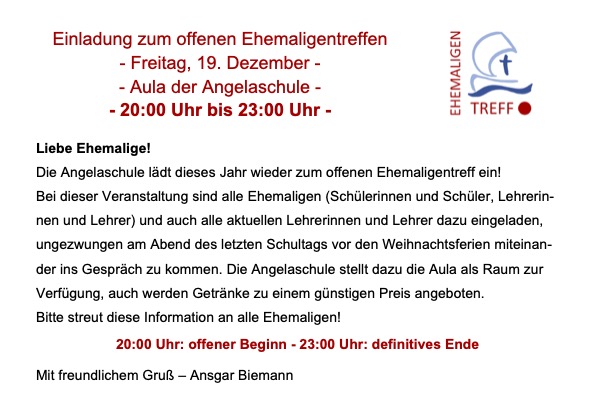 Bei dieser Veranstaltung sind alle Ehemaligen (Schülerinnen und Schüler, Lehrerinnen und Lehrer) und auch alle aktuellen Lehrerinnen und Lehrer dazu eingeladen, ungezwungen am Abend des letzten Schultags vor den Weihnachtsferien miteinander ins Gespräch zu kommen. Die Angelaschule stellt dazu die Aula als Raum zur Verfügung, auch werden Getränke zu einem günstigen Preis angeboten.