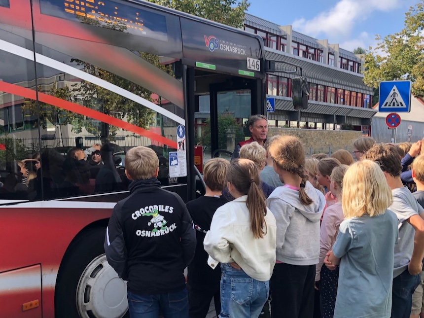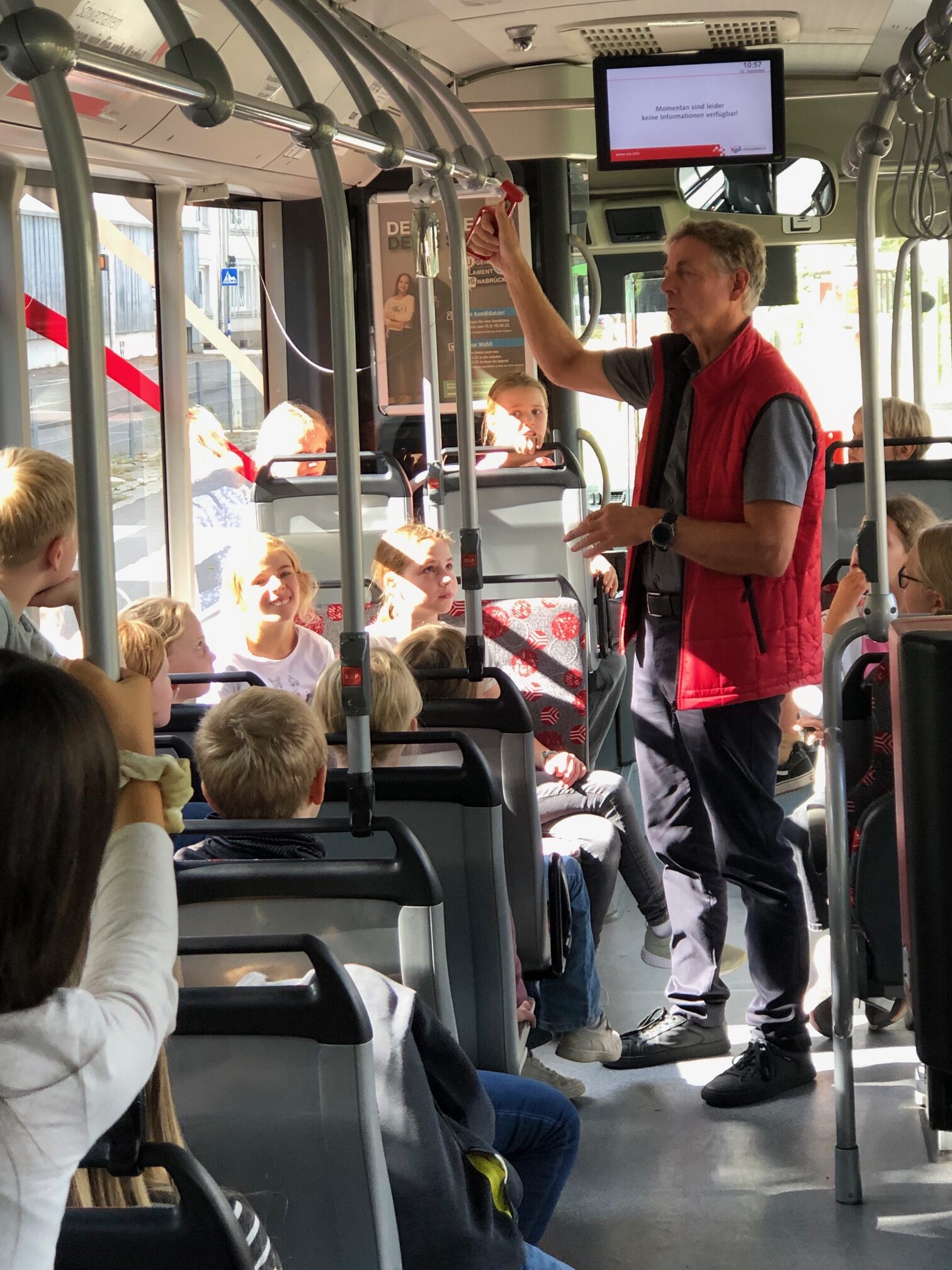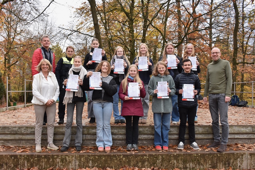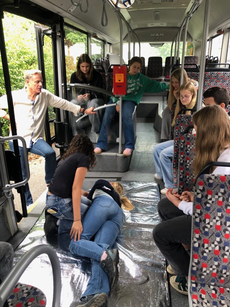 Auch dieses Schuljahr fand wieder das Busprojekt an der Angelaschule statt, inzwischen zum 16. Mal. Es besteht einerseits aus der Busschule für den Jahrgang 5, wobei die Schüler:innen lernen, wie sie sich am Bus und im Bus verhalten, um Gefahren zu vermeiden. So werden beispielsweise der tote Winkel eines Busses sowie die Bedeutung des Festhaltens im Bus anschaulich demonstriert, letzteres durch eine Vollbremsung des Busses. Andererseits wird für die Schüler:innen des Jahrgangs 8 die Buslotsenausbildung angeboten, an der dieses Mal 12 Schüler:innen teilnahmen. An insgesamt 3 Trainingsvormittagen setzten sie sich intensiv mit dem Thema Konflikte und Gewalt auseinander mit dem Ziel, bei kleineren Problemsituationen im Bus deeskalierend eingreifen zu können. Neben einem theoretischen Teil ist diese Ausbildung vorwiegend praxisorientiert angelegt: In verschiedenen Rollenspielen lernten die Schüler:innen, wie sie Problemsituationen im Bus erkennen, einschätzen sowie angemessen darauf reagieren können. Hierbei ist sehr wichtig, die Grenzen des eigenen Einschreitens zu erkennen, um sich nicht selber in Gefahr zu bringen. Die Schüle:rinnen haben die Ausbildung mit viel Elan und Engagement absolviert, insbesondere die Rollenspiele waren sehr motivierend. Bei der Nachbesprechung wurde bereits deutlich, dass die Schüler:innen viel bewusster und aufmerksamer Bus fahren als früher und sich auch selbst im Bus sicherer fühlen. Insgesamt ist diese Ausbildung sehr lohnend, da das Selbstbewusstsein und sichere Auftreten der Schüler:innen gestärkt werden, wichtige Elemente der Persönlichkeitsentwicklung. Am 11.11.25 wurden mit einigen Gruß- und Dankesworten die Buslotsen-Zertifikate und Ausweise überreicht. Die Angelaschule bedankt sich sehr herzlich bei Herrn Haunhorst von den Stadtwerken und Frau Bergmann von der Polizei für die gelungene Durchführung des Busprojektes.