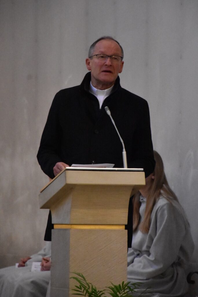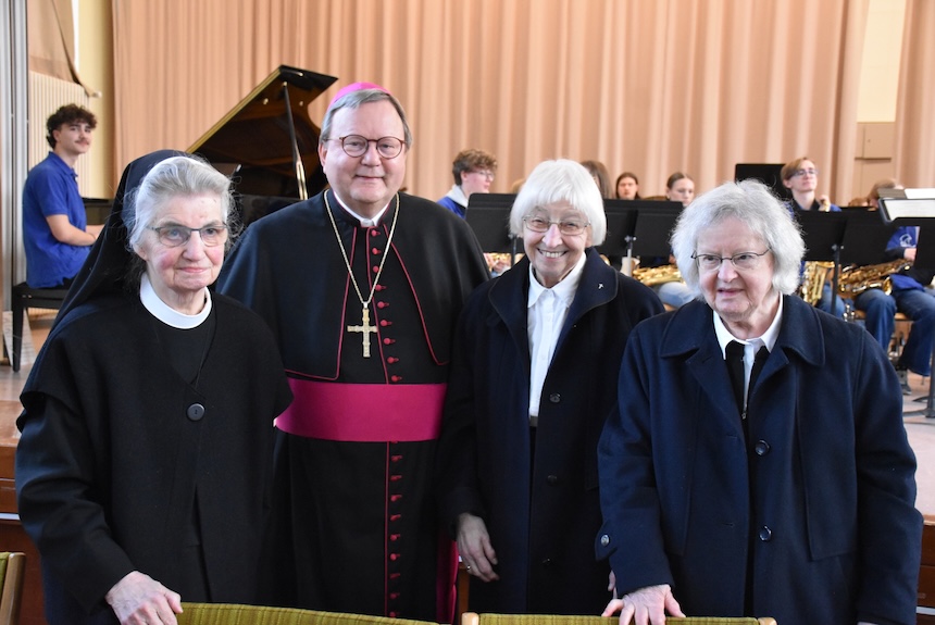 Der Gottesdienst in der Klosterkirche bildete einen würdevollen und bewegenden Auftakt des Abschiedstages. Bischof em. Franz-Josef Bode zelebrierte die Messe gemeinsam mit Generalvikar em. Domkapitular Theo Paul sowie Bischof Jean Pierre aus dem Kongo. In einem Grußwort dankte der amtierende Bischof Dominikus Meier OSB, überbracht durch den amtierenden Generalvikar Ulrich Beckwermert, den Schwestern ausdrücklich für ihren jahrzehntelangen Einsatz. Er betonte, wie sehr sie in vielfältiger Weise das Gesicht der Angelaschule geprägt hätten – mit ihrem Wirken ende eine wichtige und prägende Epoche.