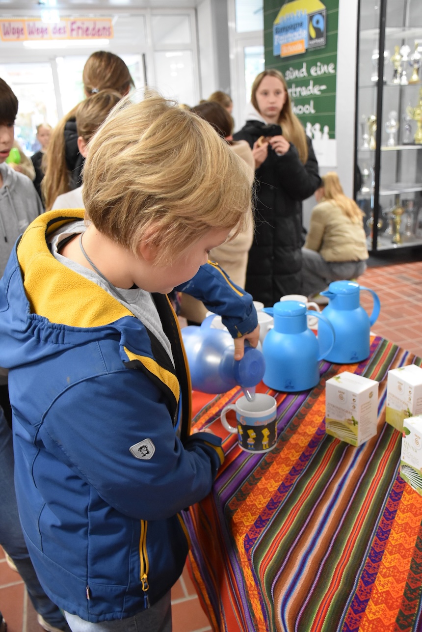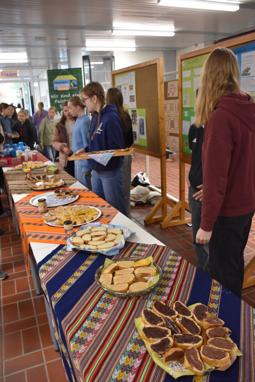 Anlässlich der erfolgreichen Erneuerung unseres Titels Fairtrade School in diesem Sommer haben wir am vorletzten Tag vor den Herbstferien zu einem fairen Frühstück eingeladen. Es gab rund 200 Schnittchen mit fairen Aufstrichen. Das Angebot reichte von süßen Cocoba-Schokoaufstrichen über Mango- und andere Fruchtaufstriche hin zu Cashew-Aufstrichen und Hummus. Dazu gab es verschiedene faire Früchte- und Kräuterteesorten zum Probieren. Dieses Angebot wurde sehr gut angenommen. Viele waren überrascht, wie gut die fairen Aufstriche schmecken. Erfreulicherweise haben wir auch bei unserem insgesamt kostenlosen Angebot einige Spenden eingenommen, von denen wir weitere Aktionen bezahlen können. Es liegt uns sehr am Herzen, wenn wir durch unsere Aktionen mehr Menschen dazu bringen können, faire Produkte zu kaufen, um wenigsten einen kleinen Beitrag zur Verbesserung der oft sehr schlechten Lebens- und Arbeitsbedingungen der Produzent:innen im Globalen Süden beizutragen.