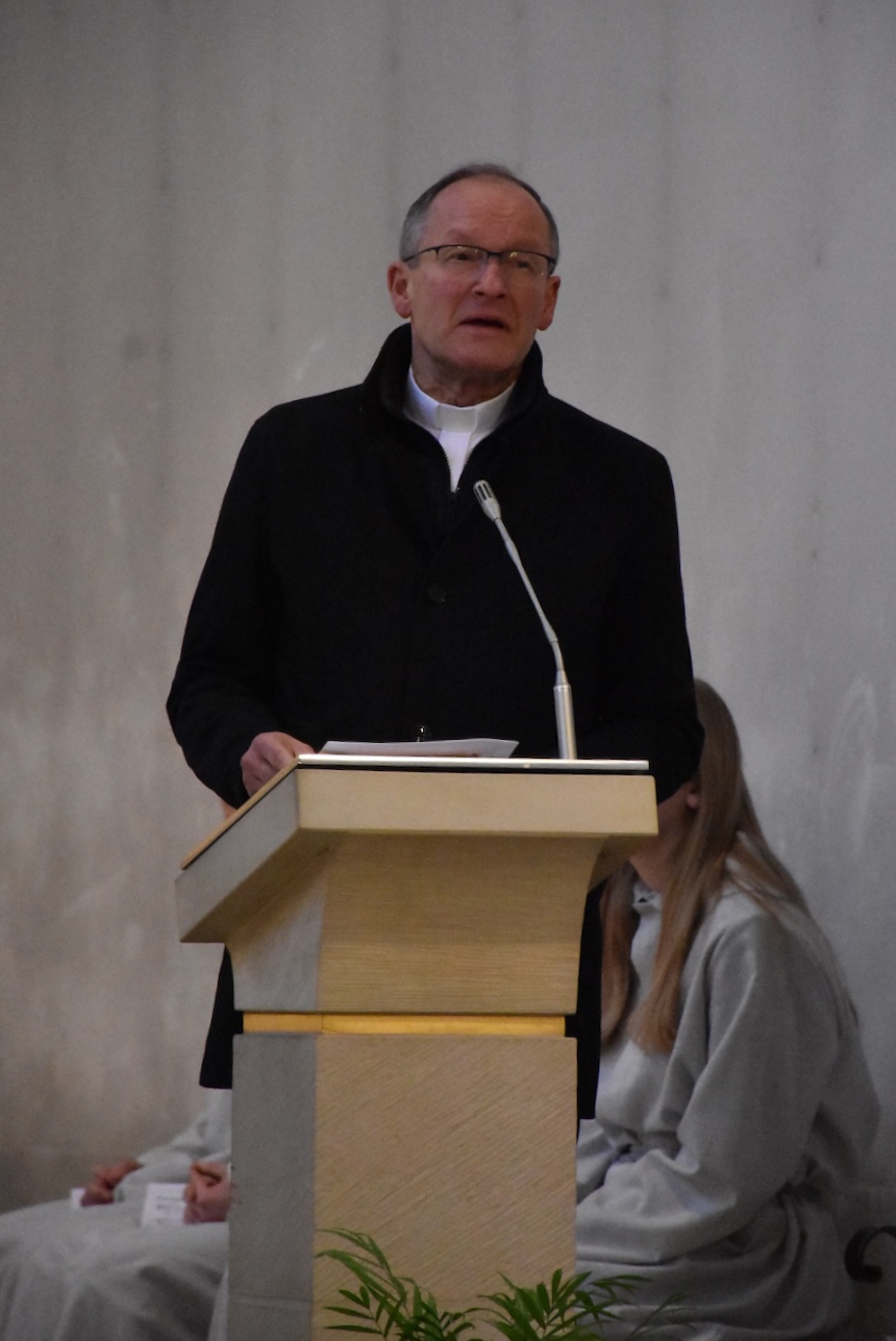 Der Gottesdienst in der Klosterkirche bildete einen würdevollen und bewegenden Auftakt des Abschiedstages. Bischof em. Franz-Josef Bode zelebrierte die Messe gemeinsam mit Generalvikar em. Domkapitular Theo Paul sowie Bischof Jean Pierre aus dem Kongo. In einem Grußwort dankte der amtierende Bischof Dominikus Meier OSB, überbracht durch den amtierenden Generalvikar Ulrich Beckwermert, den Schwestern ausdrücklich für ihren jahrzehntelangen Einsatz. Er betonte, wie sehr sie in vielfältiger Weise das Gesicht der Angelaschule geprägt hätten – mit ihrem Wirken ende eine wichtige und prägende Epoche.