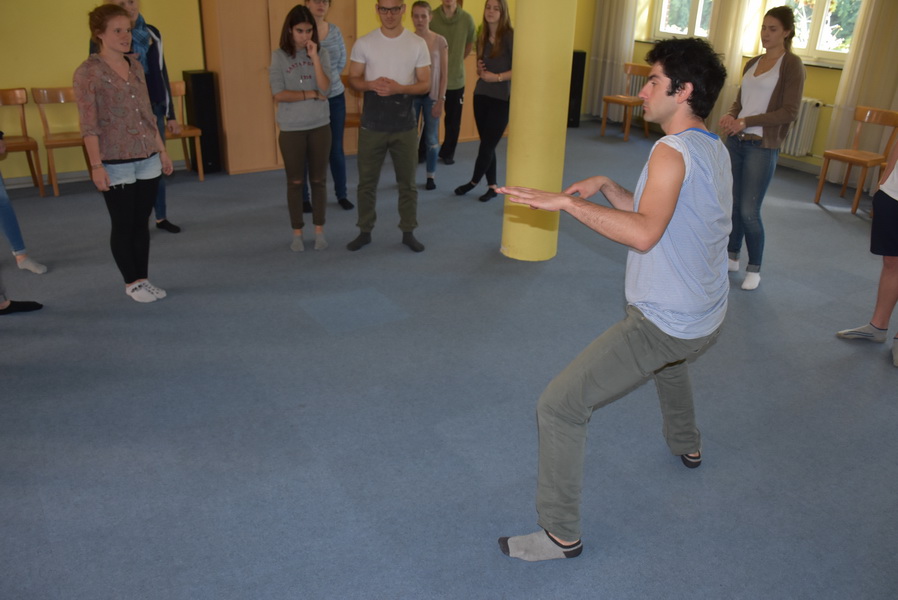 „Ihr müsst die Zuschauer davon überzeugen, dass die dargestellte Handlung“ WIRKLICH stattfindet. Und dazu müsst ihr erst einmal selbst davon überzeugt sein und die Absicht haben, diese Handlung auch wirklich auszuführen.“ Wie man seine ganze Energie fokussiert und in die theatrale Handlung fließen lässt, war eine der wichtigsten Erlebnismöglichkeiten in den vielfältigen Übungen.