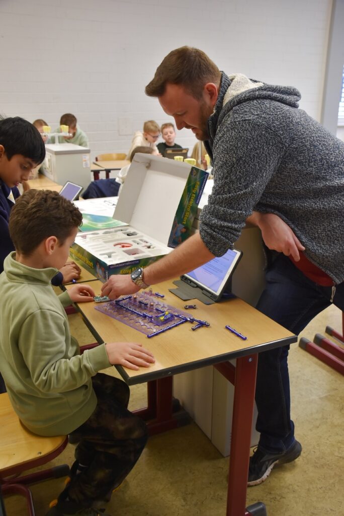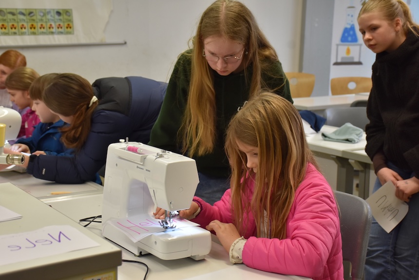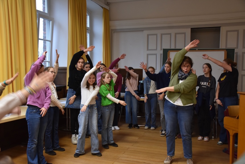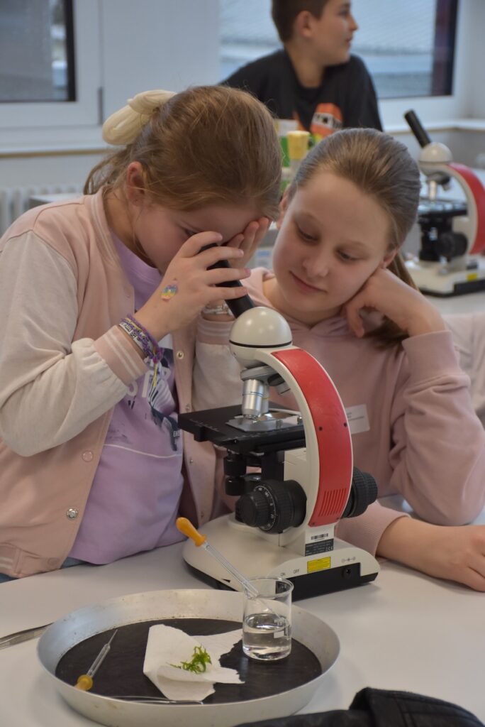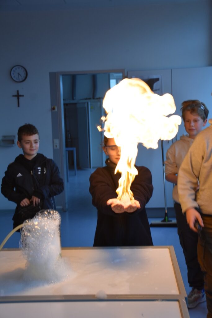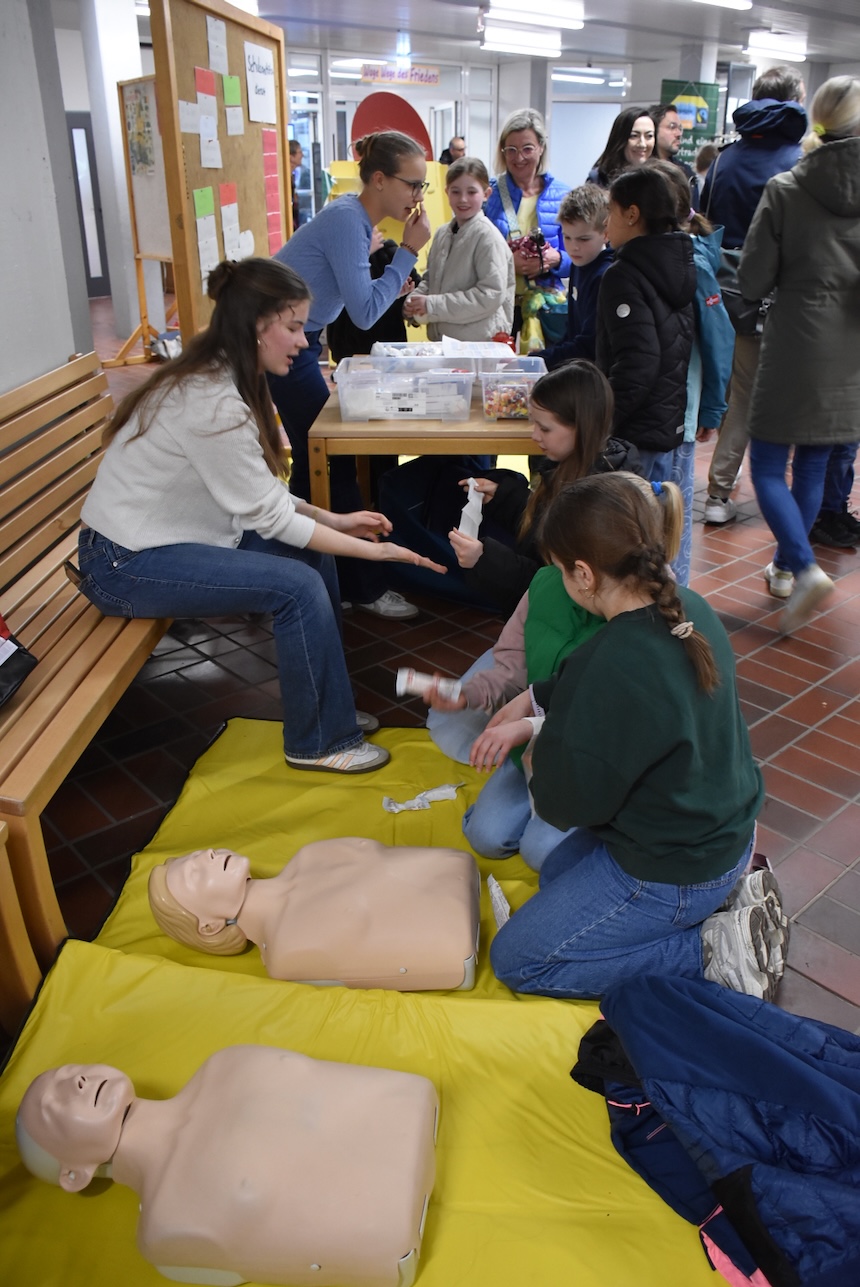 Im gesamten Schulgebäude gab es viel zu entdecken und auszuprobieren. In Klassenräumen, Fluren und Fachräumen warteten vielfältige Mitmachaktionen auf die kleinen und großen Besucher:innen. Auf dem Ruder-Ergometer konnten sportliche Gäste ihre Kräfte testen, während in Physik und Chemie spannende Experimente zum Staunen einluden. In anderen Räumen wurde an Nähmaschinen genäht, in den Kunsträumen gebastelt oder beim Schulsanitätsdienst das Anlegen von Verbänden geübt. Die Akrobatik-AG zeigte ihr Können und lud zum Mitturnen ein, und im Computerraum konnten Interessierte erste Schritte im Programmieren ausprobieren.