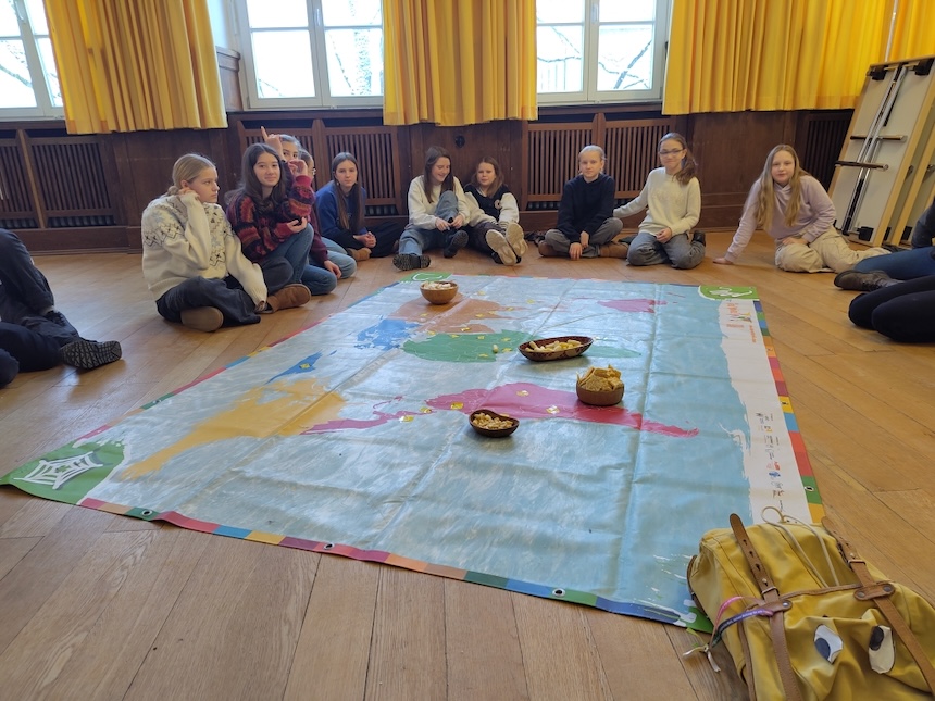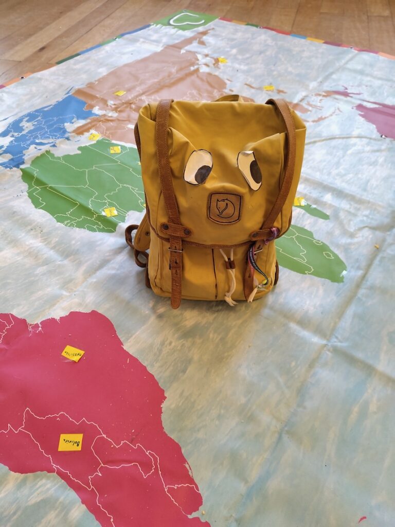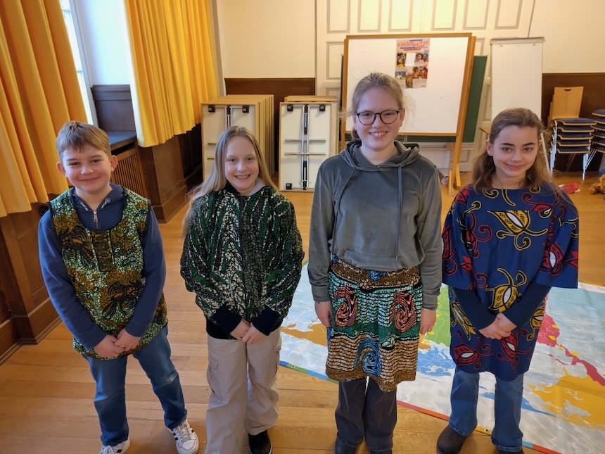 „Was möchtet ihr werden? Wie stellt ihr euch eure Zukunft vor?“ Diese Fragen am Ende der Erzählungen des gelben Rucksacks von seinen Erlebnissen in Kamerun beantworteten die Schüler:innen der 6. Klassen konkret: „Lehrerin“, „Arzt“, „Ingenieurin“, „Tischler“, „Sozialarbeiterin“. Viele Kinder weltweit, die sie in den Projektstunden kennen gelernt haben, haben ähnliche Vorstellungen. Alexis möchte (Öko-)Bauer auf seiner eigenen Finca werden, im Hochland von Kolumbien, wie seine Eltern. Louisette und Valeria auf Madagaskar wünschen sich, zu einer weiterführenden Schule zu gehen, damit sie überhaupt einen guten Beruf erlernen können. Die Schüler:innen erfuhren von Fatema und Chumki aus Bangladesch, wie toll die begrünten Dächer der Hütten in ihrem Viertel sind als Schutz vor der starken Sonne und damit auch als Kühlung. Sie wollten es selbst lernen. Und jetzt können sie es auch anderen Familien zeigen, ihre eigenen Hütten zu begrünen, um dann auch selbst Früchte zu ernten. Begleitet durch Probieren von getrockneten und gerösteten Maiskörnern und dem Anprobieren der „superwarmen“ Alpakapullover tauchten die Schüler:innen ein in die Lebenswirklichkeit von Angel in den Bergen zwischen den Vulkanen in El Salvador. Faszinierend zu erfahren, wie Angel mit seinen Eltern lernt, aus selbstgemachten Lehmziegeln erdbebensichere Häuser zu bauen.