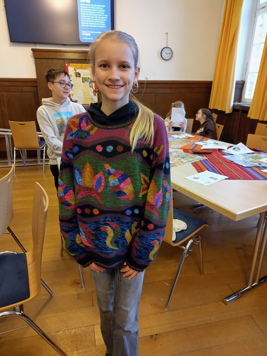 „Was möchtet ihr werden? Wie stellt ihr euch eure Zukunft vor?“ Diese Fragen am Ende der Erzählungen des gelben Rucksacks von seinen Erlebnissen in Kamerun beantworteten die Schüler:innen der 6. Klassen konkret: „Lehrerin“, „Arzt“, „Ingenieurin“, „Tischler“, „Sozialarbeiterin“. Viele Kinder weltweit, die sie in den Projektstunden kennen gelernt haben, haben ähnliche Vorstellungen. Alexis möchte (Öko-)Bauer auf seiner eigenen Finca werden, im Hochland von Kolumbien, wie seine Eltern. Louisette und Valeria auf Madagaskar wünschen sich, zu einer weiterführenden Schule zu gehen, damit sie überhaupt einen guten Beruf erlernen können. Die Schüler:innen erfuhren von Fatema und Chumki aus Bangladesch, wie toll die begrünten Dächer der Hütten in ihrem Viertel sind als Schutz vor der starken Sonne und damit auch als Kühlung. Sie wollten es selbst lernen. Und jetzt können sie es auch anderen Familien zeigen, ihre eigenen Hütten zu begrünen, um dann auch selbst Früchte zu ernten. Begleitet durch Probieren von getrockneten und gerösteten Maiskörnern und dem Anprobieren der „superwarmen“ Alpakapullover tauchten die Schüler:innen ein in die Lebenswirklichkeit von Angel in den Bergen zwischen den Vulkanen in El Salvador. Faszinierend zu erfahren, wie Angel mit seinen Eltern lernt, aus selbstgemachten Lehmziegeln erdbebensichere Häuser zu bauen.