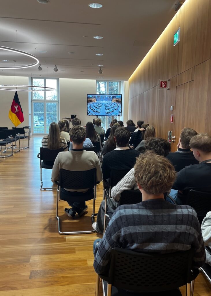 Einen intensiven Einblick in die parlamentarische Arbeit erhielten Schüler:innen der Angelaschule bei ihrem Besuch im Niedersächsischen Landtag in Hannover. Zur inhaltlichen Orientierung diente ein einführendes Video, das die Strukturen, Aufgaben und Arbeitsweisen des Landesparlaments anschaulich erläuterte und so eine fundierte Grundlage für die weiteren Eindrücke schuf.