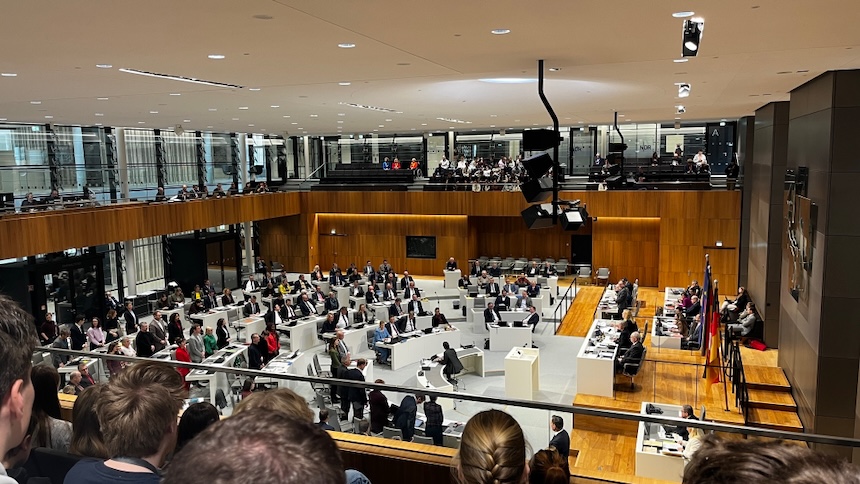 Ein besonderer Schwerpunkt des Besuchs lag im Erleben der Plenarsitzung von der Besuchertribüne aus. Dort verfolgte die Gruppe die Schlussabstimmung über den Haushalt 2026, die als Königsdisziplin parlamentarischer Arbeit gilt. Ferner bekamen sie im Zuge der ersten Beratung zum Antrag „Kostenfreie Tablets für Schülerinnen und Schüler ab Klasse 7“ einen direkten Eindruck davon, wie parlamentarische Debatten geführt, Positionen vertreten und Argumente ausgetauscht werden.
