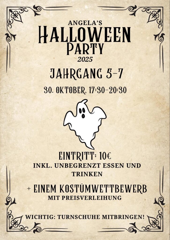 Am 4. November von 17-20 Uhr veranstaltet der 13. Jahrgang eine Party anlässlich Halloweens für die Schüler:innen der Klassen 5-7 unserer Schule. Veranstaltungsort ist die Aula der Angelaschule. Es wird Kuchen, Kekse sowie ein Freigetränk für jede/-n geben. Ansonsten werden Spiele, gute Musik, ein Kostümwettbewerb und natürlich Partytänze für tolle Stimmung sorgen! Lehrer:innen werden anwesend sein und die Aufsichtspflicht übernehmen.