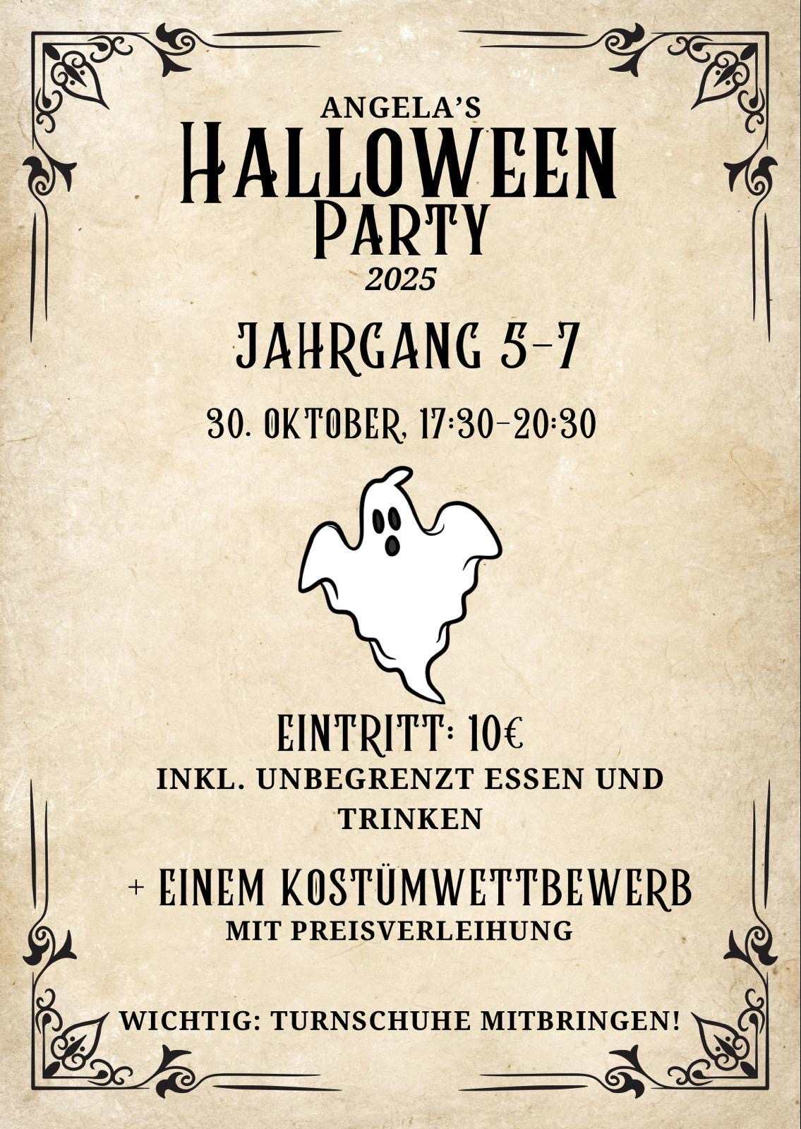 Am 4. November von 17-20 Uhr veranstaltet der 13. Jahrgang eine Party anlässlich Halloweens für die Schüler:innen der Klassen 5-7 unserer Schule. Veranstaltungsort ist die Aula der Angelaschule. Es wird Kuchen, Kekse sowie ein Freigetränk für jede/-n geben. Ansonsten werden Spiele, gute Musik, ein Kostümwettbewerb und natürlich Partytänze für tolle Stimmung sorgen! Lehrer:innen werden anwesend sein und die Aufsichtspflicht übernehmen.