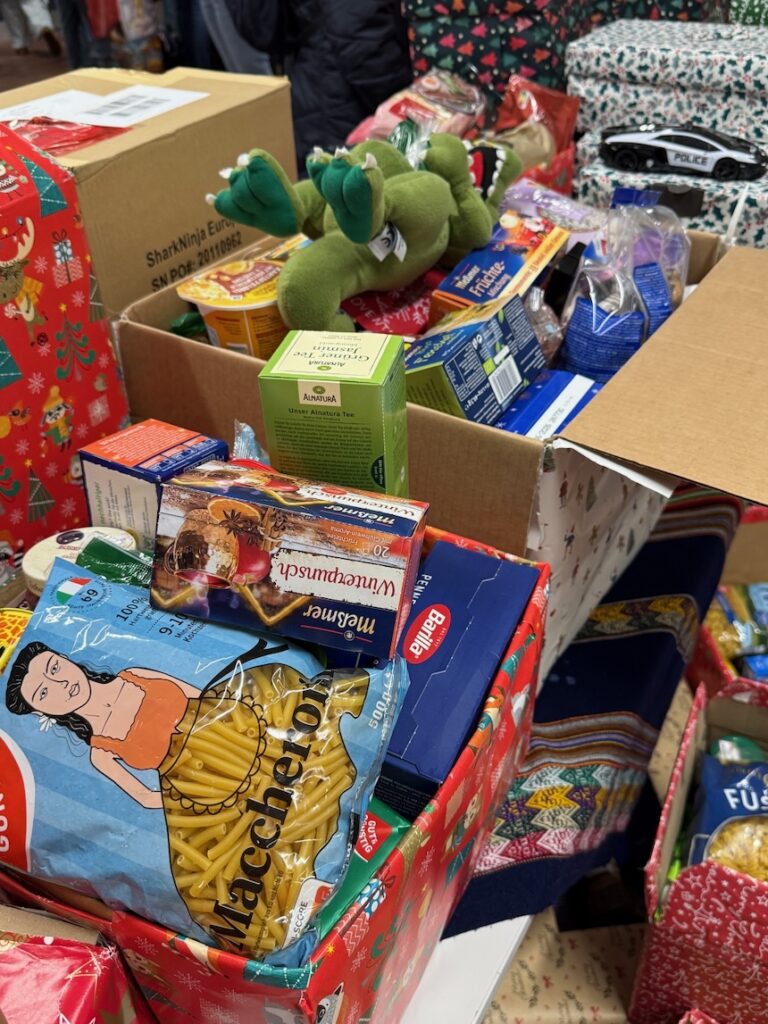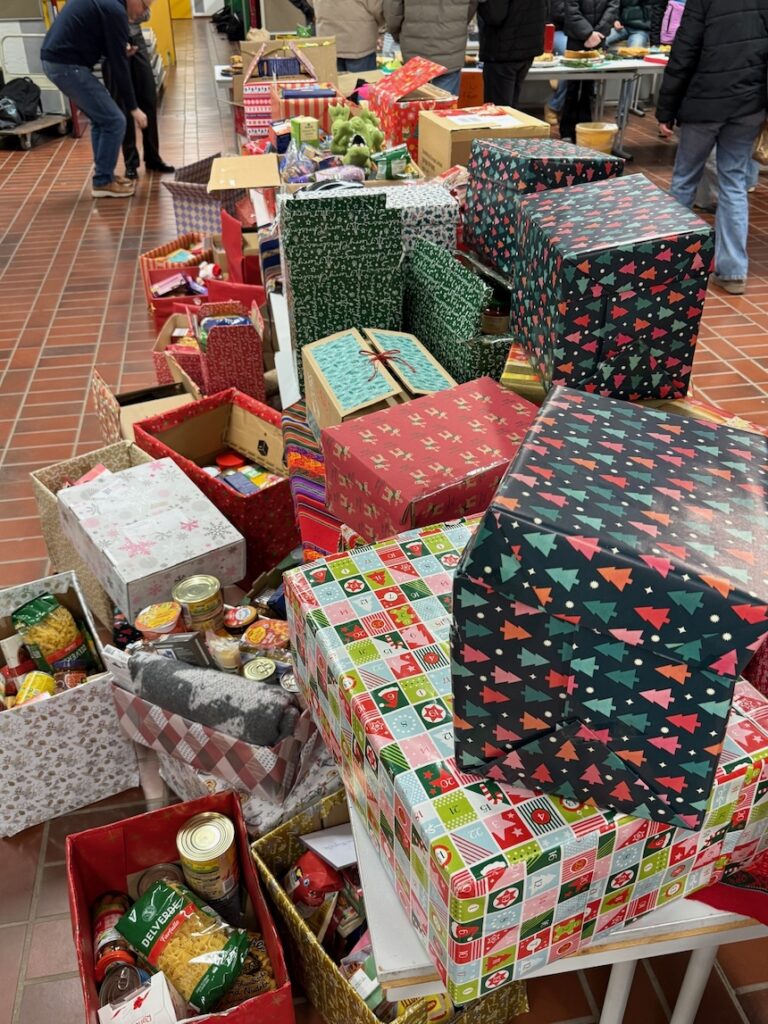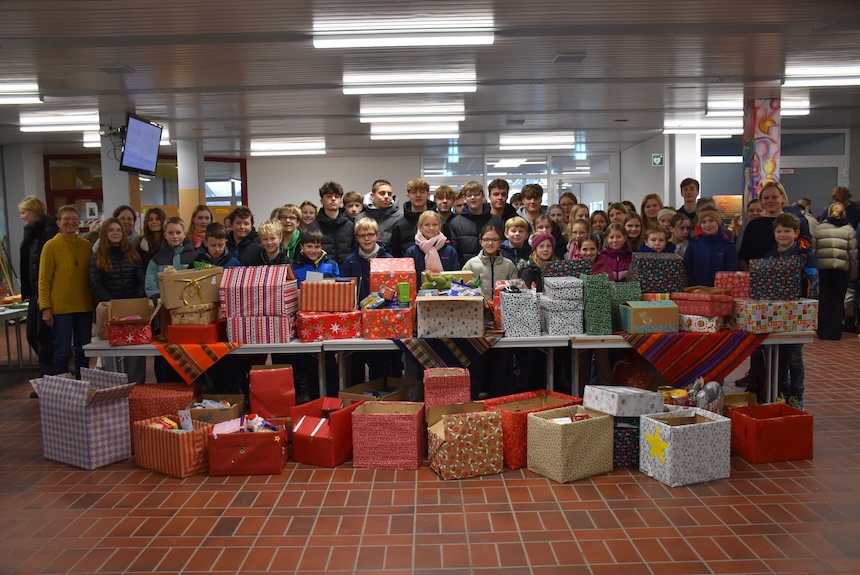 Unsere Schule hat auch dieses Jahr wieder eine tolle Nikolausaktion veranstaltet. Wir durften das erste Mal daran teilnehmen. Jede Klasse und jeder Kurs hat Lebensmittel und Spielzeug, wie z.B. Nudeln, Süßigkeiten, Seife, kleine Spiele, Malbücher und Stifte gesammelt und diese Spenden in einem großen Karton verpackt. Jeder hatte etwas von zu Hause mitgebracht, sodass am Ende jeder Karton vollgepackt war. Die Kartons wurden noch weihnachtlich mit Geschenkpapier, Schleifen und bunten Bändern verpackt. Einige Klassen legten auch selbst geschriebene Briefe in die Kartons. Wir hatten viel Spaß dabei. Als alles fertig war, wurden die Pakete zu verschiedenen Stationen gebracht. Dort werden sie dann weiter verteilt. Mit den Paketen helfen wir bedürftigen Familien, die nicht so viel haben. Wir finden es gut, dass wir anderen Menschen helfen können. Die Nikolausaktion war eine schöne Erfahrung und hat gezeigt, dass man gemeinsam viel Gutes tun kann. (Klasse 5c mit Herrn Düvel & Frau Knäuper)